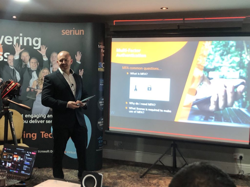 After the interval, Seriun’s cyber security expert Wayne Fulton led the concluding segment, focussing on Microsoft’s Cyber Security Solutions that are designed to protect business assets and keep Personal Identifiable Information (PII) safe and secure. Wayne covered three main areas: Multi-Factor Authentication (MFA), Conditional Access and email encryption. He could not stress enough how vital and effective MFA is in preventing cyber crime.